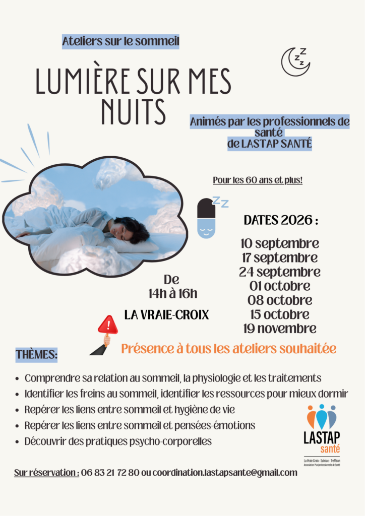 Nous vous proposons sept ateliers qui abordent le sommeil, à destination des patients de plus de 60 ans et qui souffrent de troubles du sommeil
